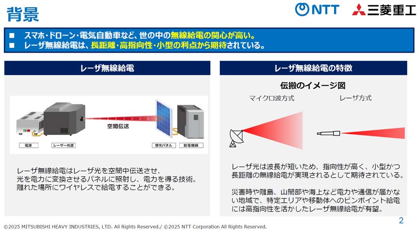 NTTと三菱重工業(以下、三菱重工)は2025年9月17日、レーザー光を用いて1km離れた場所に電力を供給する「レーザー無線給電」の実証に成功したと発表した。