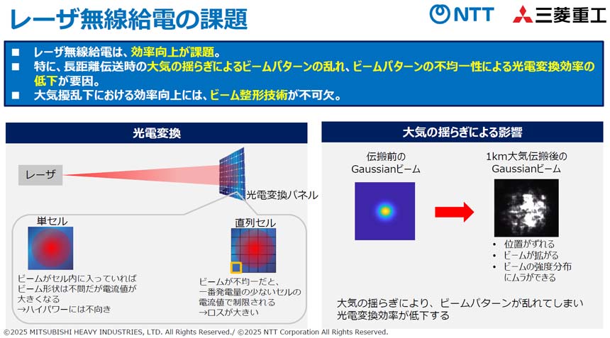 また、大気の揺らぎによってビームの位置がずれ、ビームの強度分布にムラが生じることで、光電変換の効率が低下するという課題もあるという。