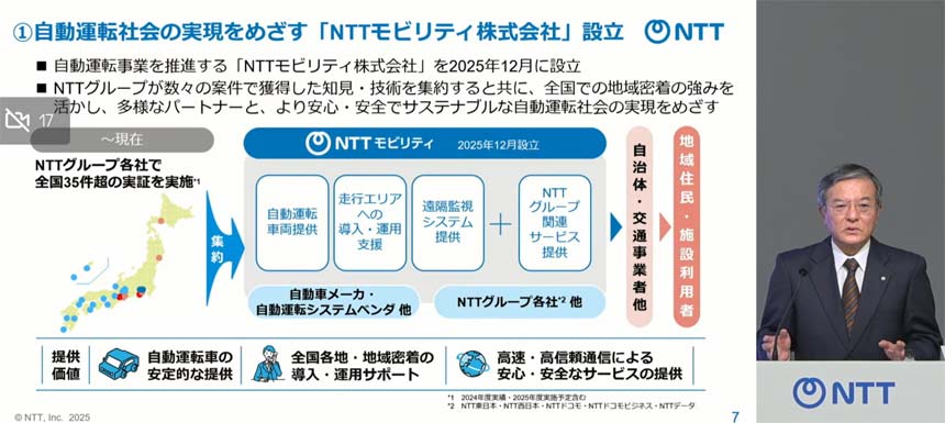 NTTは2025年11月4日、2025年度第2四半期(2Q)の決算会見を開催。あわせて、自動運転の新会社「NTTモビリティ」を12月15日に新設すると発表した。