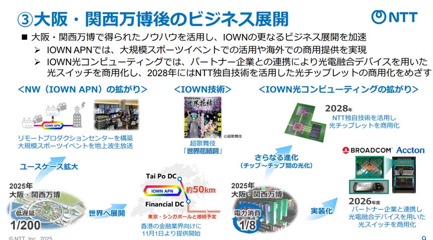 NTTパビリオンでは、IOWN APN(オールフォトニクス・ネットワーク)を活用したPerfumeのライブパフォーマンスの3D空間伝送などを実施したが、これらの取り組みで得られた知見を活かし、IOWNのビジネス展開をより一層加速させていくとした。
