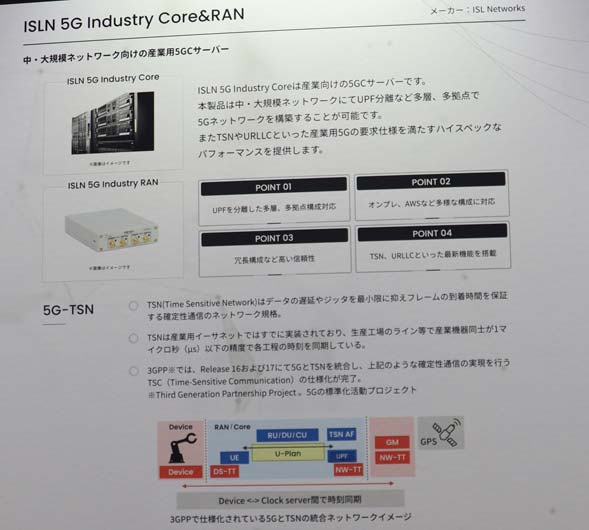 ISL Networksは、オープンソースの5Gコア「free5GC」をベースに開発した“売り切り150万円”からのローカル5Gソリューション「ISLN 5G Business」や、イーサネットの拡張規格「TSN」(Time Sensitive Networking)に対応したハイスペックモデル「ISLN 5G Industry」などをブース内で披露している。