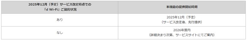 また、自動解約の対象となるユーザーについては、新たに「d Wi-Fi都度利用機能(仮称)」を2026年度内に提供を開始する。dアカウントを持っていれば利用可能で、自動解約となっても引き続きd Wi-Fiを使用できるという。なお、d Wi-Fiを契約中のユーザーには、2025年12月(予定)から同機能を先行提供していくとしている。