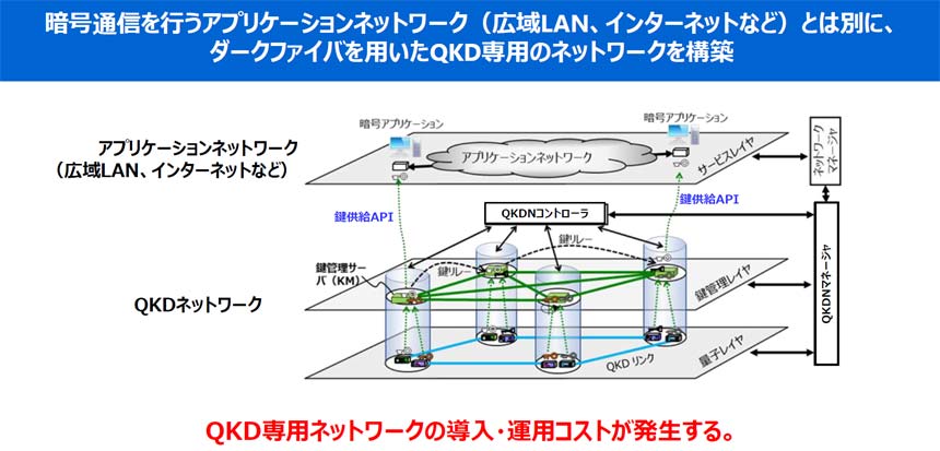 こうした特徴から、QKDは量子コンピューター時代でも安心して使えるセキュリティソリューションとして注目を集めており、これまでもQKDを用いた拠点間通信の実証などが行われてきた。しかし、「QKD信号を理想的な条件で伝送するため、ダークファイバーを用いてQKD専用のネットワークを構築しなければならず、大きな導入・運用コストがかかっていた」(勝部氏)。