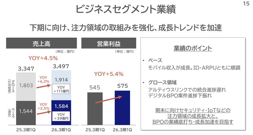 ビジネスセグメントの売上高は、前年度比4.5%増の3497億円、営業利益は同5.4%増の575億円だった。「まだ期待値には届いていないが、セキュリティ・IoTなどの注力領域でリカバリーする」(松田氏)とした。