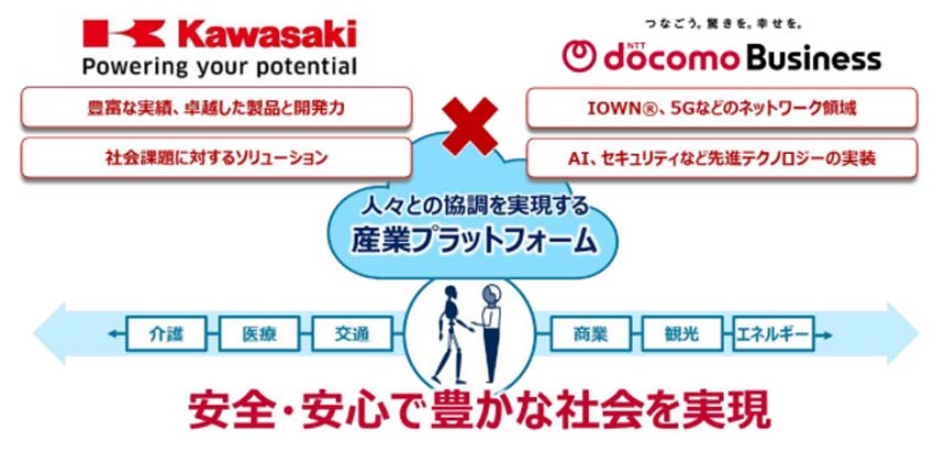川崎重工が持つロボット・モビリティにおける豊富な実績と、NTT ドコモビジネスのIOWN・5GなどのネットワークやAI・セキュリティをはじめとする先進テクノロジーの知見を組み合わせ、ロボット・モビリティ・社会インフラ等がネットワークに連携される環境を整え、安全・安心で豊かな社会の実現および持続的な発展への貢献を目指すという。