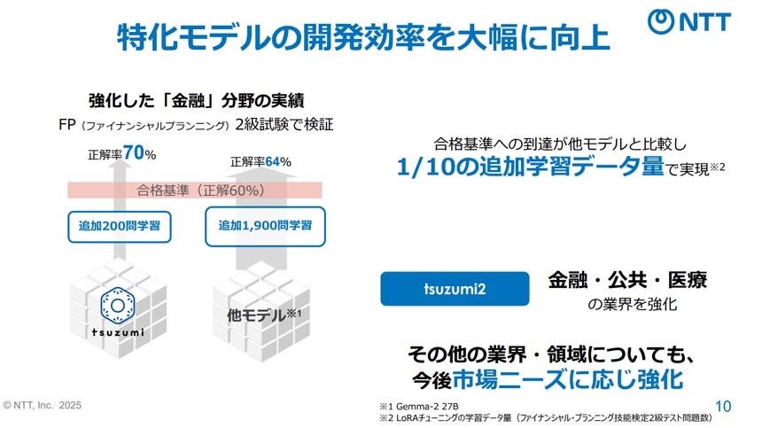 例えばFP(ファイナンシャルプランニング)2級試験は、約60%の正答率で合格するとされているが、島田氏によれば、Gemma-2 27BにFP2級の問題を解かせる場合、約1900問の回答を学習させてようやく正答率は約64%に達する。対してtsuzumi 2は、その1/10にあたる約200問の学習で、正答率70%を実現できるとアピールした。