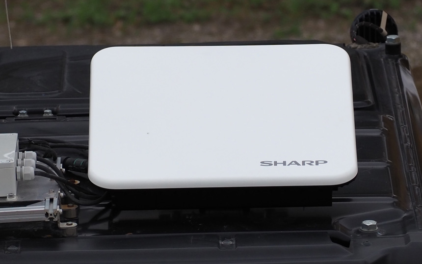 建設機械の屋根に設置されたシャープ製衛星通信ユーザー端末