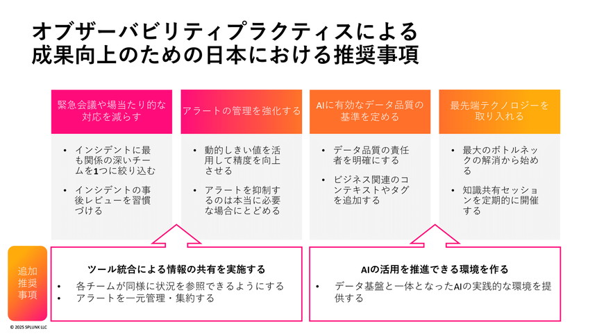 末永氏は、日本企業がオブザーバビリティの成果を高めるには、AI活用を推進できる「データ基盤と一体化した実践的環境」を構築することが重要だと強調した。これによりツールの分散を防ぎ、管理コストの抑制と利便性の両立が可能になるという。