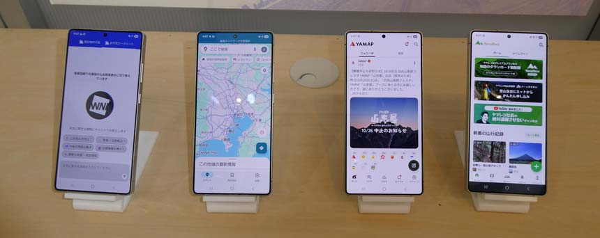 ここからは、屋内エリアの展示の一部を紹介する。「ネットワーク・衛星通信」エリアでは、衛星とスマホと直接通信サービス「au Starlink Direct」に関する展示が行われており、X(旧Twitter)やGoogleマップなど、対応アプリが圏外エリアでどのように動作するのか、体験することができる。