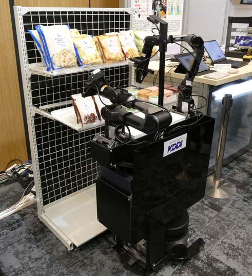 「リテール」エリアでは、AIやロボットに関する展示が目立った。その1つが画像解析AIと陳列ロボットで、KDDIはローソンと共同でこれらを活用したリテールDXの実証に取り組んでいる。