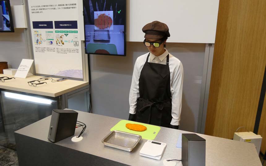 KDDIは、AIグラスを調理などの作業支援にも応用可能だと見ており、イベントのデモでは、「とんかつはどうやって揚げる?」という調理者の声をマイクが拾い、とんかつの揚げ方をAIグラスのディスプレイに表示する様子が披露されている。