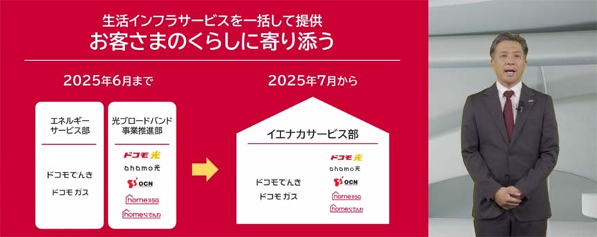 これまではドコモでんきやドコモガスなどを手掛ける「エネルギーサービス部」と、ドコモ光・ahamo5G・home5Gなどを担当する「光ブロードバンド事業推進部」がそれぞれ独立してサービスを展開していたが、両部門を統合し、イエナカサービス部として再編した。