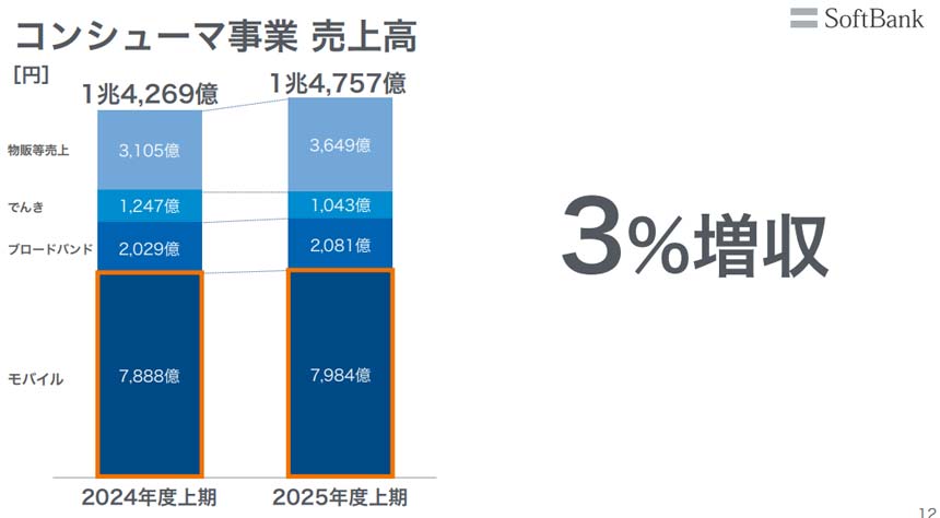 セグメント別に見ていくと、コンシューマー事業の売上高は前年度比3%増の1兆4757億円、うちモバイル事業は同1%増の7984億円となった。
