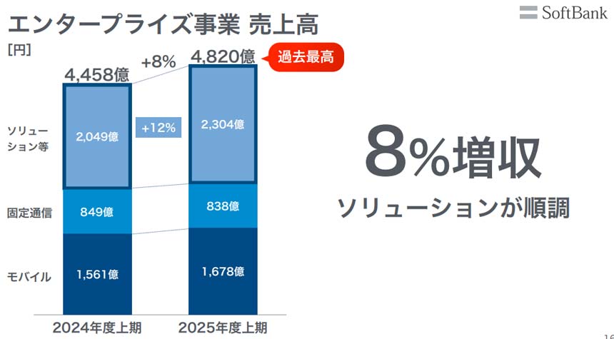 エンタープライズ事業の売上高は前年度比8%増の4820億円、うちソリューション事業が同12%増の2304億円と好調だった。営業利益は同10%増の1041億円となった。