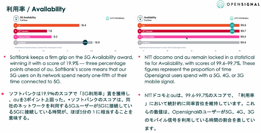 モバイルネットワークに接続している時間のうち、5Gを利用できる割合を示す「5G利用率」はソフトバンクがトップで、「モバイル利用時間の約20%が5Gにつながっている」(ヴィルジコウスキー氏)。なお、3G/4Gを含む利用率では、KDDIとNTTドコモが同率首位だった。