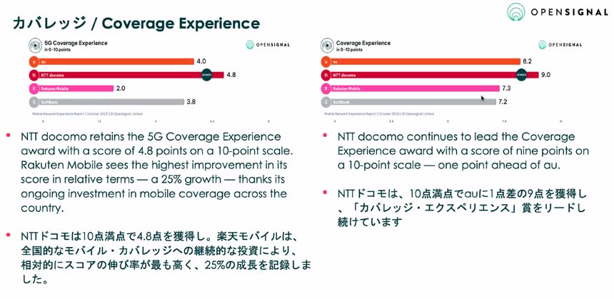 カバレッジに関しては前回同様、NTTドコモが首位を維持したが、前回調査からの伸長率は楽天モバイルが最も高かった。「カバレッジ拡大に向けた継続的な投資が功を奏したのではないか」とヴィルジコウスキー氏は分析した。
