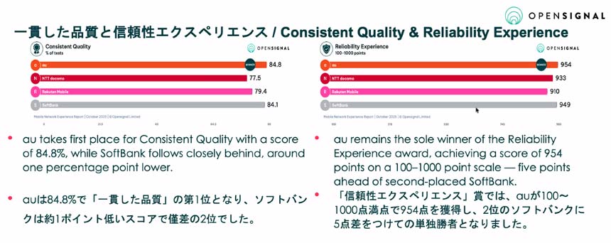 モバイルネットワークがアプリやサービス利用時に安定して十分な品質を維持できるかを評価する「一貫した品質と信頼性エクスペリエンス」では、3期連続でKDDIが首位に輝いた。