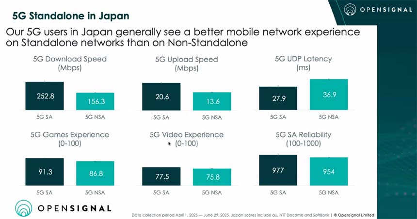 また、ユーザー端末から測定用サーバーまでの遅延は27.9ミリ秒(ms)と、NSAと比べて約25%の遅延を削減。ゲーム/ビデオ・エクスペリエンスや信頼性でも、5G SAが優位であることが示された。
