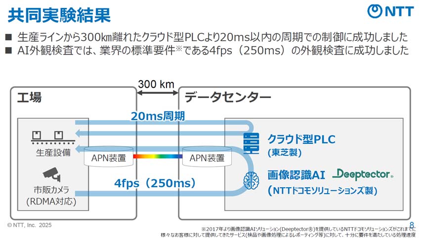 結果、約300kmの距離があるベルトコンベア-クラウド型PLC間をAPNでつなぐことで、遅延20ミリ秒(ms)でベルトコンベアを制御できることを確認した。