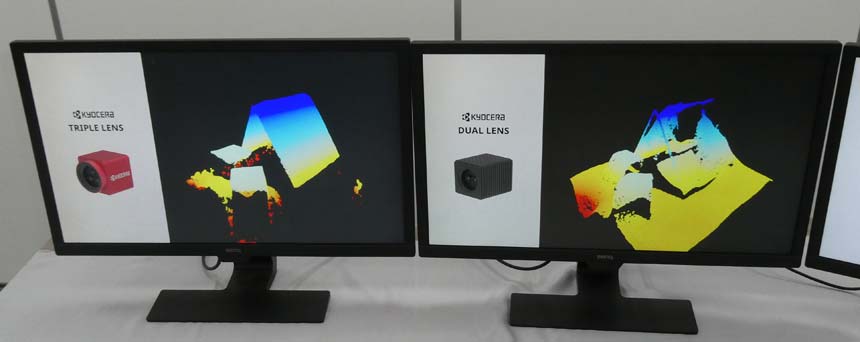 対象物までの距離やサイズを測定できる「3眼AI測距カメラ」も展示予定。京セラは、2つのレンズを持つ2眼AI測距カメラを昨年のCES 2025にて展示したが、「繰り返しパターンや半透明の物体の測距は困難だった」(説明員)。