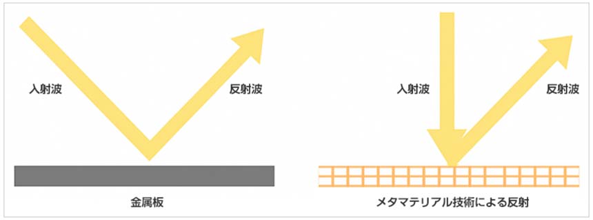 金属板による正反射とメタマテリアル技術による反射のイメージ