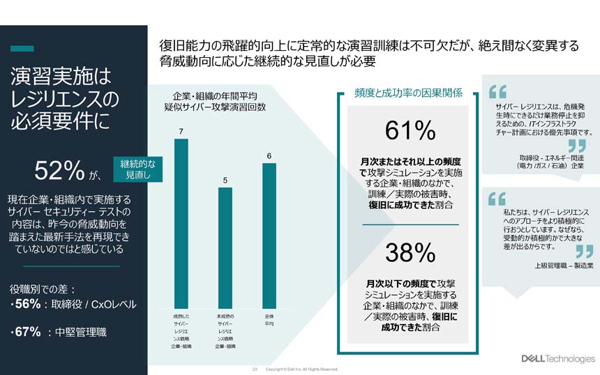 サイバーレジリエンスの強化のためには、頻繁なテストが効果的な備えになると西賴氏。同社の調査によると、毎月またはそれ以上の頻度でシミュレーションを実施した組織では61%が復旧に成功したのに対し、月1回より少ない頻度でしかテストを実施していない場合、復旧成功率は38%にとどまったという。