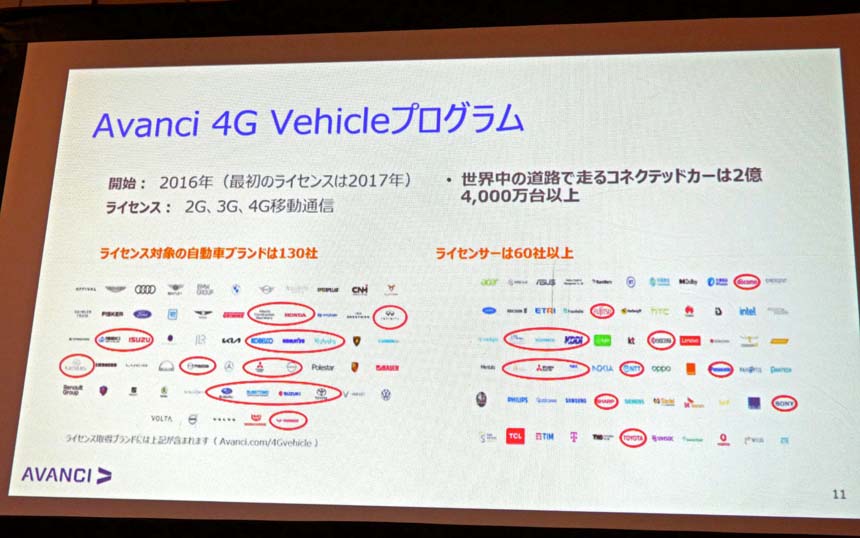 2016年に開始したAvanci 4G Vehicleプログラムでは、2G、3G、4G移動通信のライセンスを提供し、現在130社以上の自動車ブランドが参加。世界中で2億4000万台以上のコネクテッドカーにライセンスを供与し、参加するライセンサー(特許所有者)の数は60社以上に上るという。