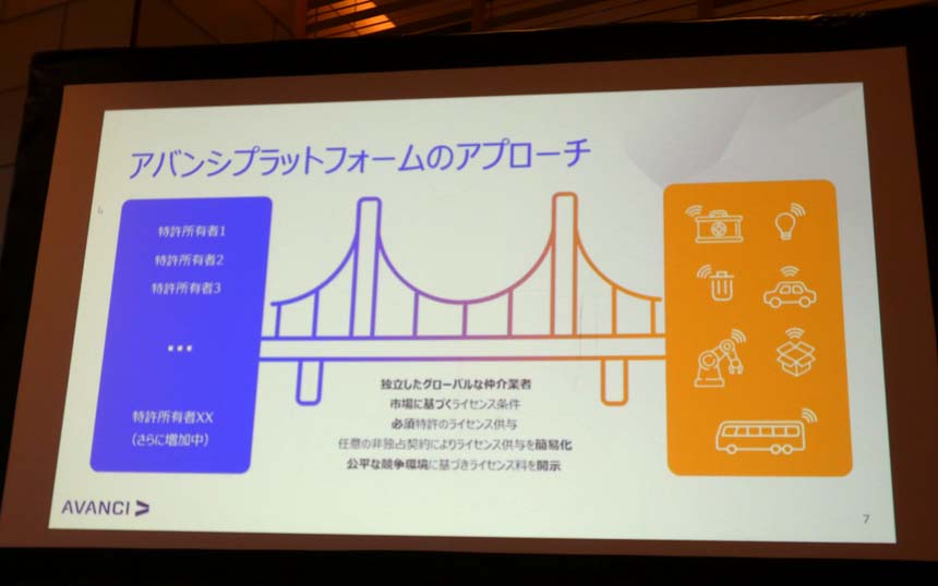アバンシの中核事業は、コネクテッドカー向けのライセンスプログラムで、同社は特許権者と自動車メーカーの間に立ち、コネクテッドカーに必要な移動通信技術の特許を一括でライセンス(使用許諾)する仕組みを提供している。自動車メーカーは個別に特許権者と交渉する手間とコストを削減でき、特許権者は効率的に自動車業界全体にライセンスを供与できるという。