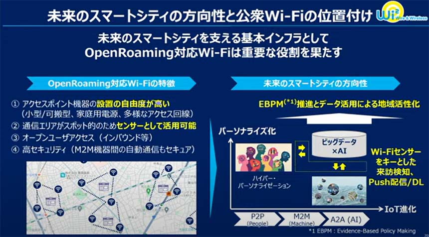Wi2 代表取締役社長の向吉智樹氏は、OpenRoaming対応Wi-Fiの整備が、未来のスマートシティにおいて重要になると強調。「強固なセキュリティに加え、アクセスポイント機器は小型で設置の自由度が高く、センサーとしても使える。そこで得られたデータとAIのかけ合わせが、スマートシティに活きてくるだろう」
