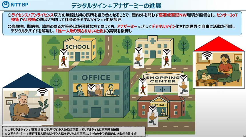 NTTBP 代表取締役社長の加藤成晴氏は、「Wi-FiやLPWA、ミリ波、ローカル5Gなど多様な通信手段をベストミックスすることで、スマートシティは成り立つ」と持論を展開。また、これらの通信技術を活用して「社会のデジタルツイン」を構築し、高齢者や障害者が自分の分身となるAIエージェント「Another me」を介し、デジタル空間を自由に行動できる世界を目指すとした。