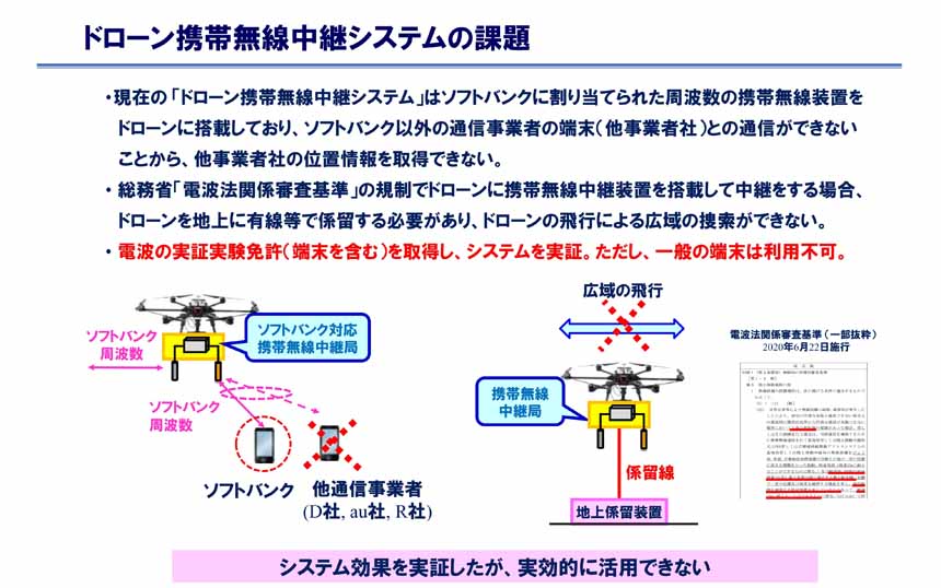 ソフトバンクに割り当てられた周波数の携帯無線装置を使用していたため、他の通信事業者の端末とは通信ができず、ドコモ、au、楽天モバイルユーザーなどの位置情報の取得が困難だった。また、電波法関係審査基準の規制により、ドローンを地上に有線で係留する必要があり、広域の捜索ができなかったことから、藤井氏は「実証実験の免許を取得してシステムを検証したが、一般端末は利用できず、十分に活用ができなかった」と当時を振り返った。
