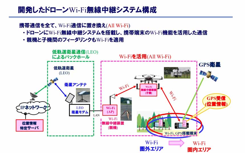 そこで着目したのがWi-Fiだという。Wi-Fiは通信事業者に依存せず、ほぼすべてのスマートフォンに内蔵されている、また、2.4GHz帯のWi-Fiは電波法関係審査基準の規制がなく、上空での無線中継が可能なのがメリットだという。新システムは携帯通信をすべてWi-Fi通信に置き換える「All Wi-Fi」のコンセプトで構築。具体的には、遭難者のスマートフォンとドローン上の中継装置(子機)、ドローンと地上の中継装置(親機)、さらに地上装置からインターネットへの接続まで、すべての通信経路でWi-Fiを活用する。インターネット接続には低軌道衛星(LEO)通信を採用することで、山間部などでも容易にシステムを展開できるようになったと藤井氏は説明した。