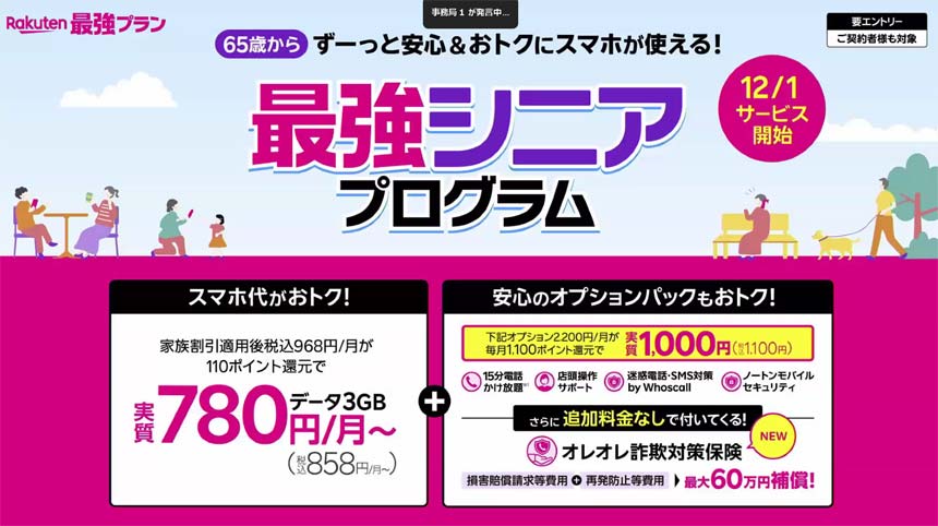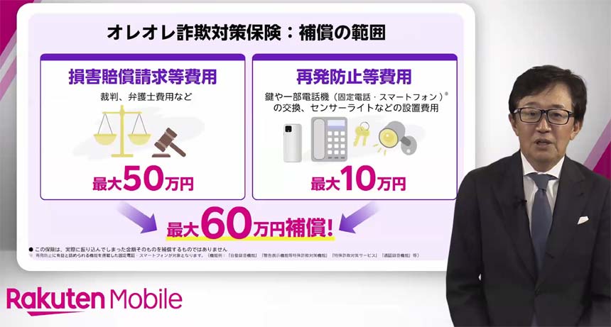 楽天モバイルは2025年12月1日にプレスカンファレンスを開催し、「最強シニアプログラム」のオプションサービス「15分かけ放題&安心パック」に加入する契約者を対象に、振り込め詐欺の被害にあった際の裁判・弁護士費用などを最大60万円補償する「オレオレ詐欺対策保険」を提供開始したと発表した。