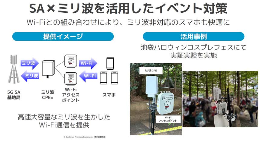 また、2025年10月に開催された「池袋ハロウィンコスプレフェス」では、SA方式で提供されるミリ波(28GHz)をFWA(固定無線アクセス)のバックホール回線として活用し、来場者向けの公衆Wi-Fiサービスを提供。3日間で延べ16万人以上が来場した屋外イベント会場において、ミリ波非対応のスマートフォンでも快適に通信できたという。