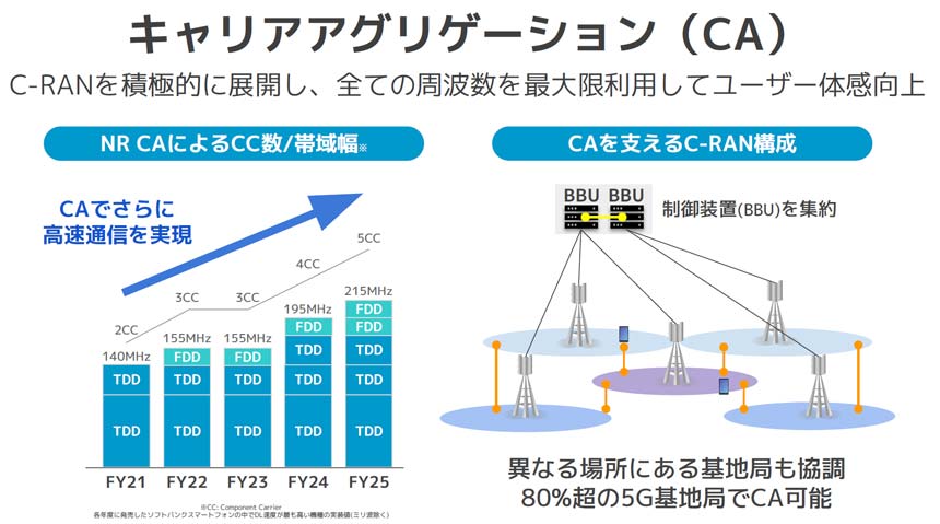 また、基地局の制御装置(BBU)を集約して設置するC-RAN(Centralized RAN)構成により、複数セル・周波数を一元的に把握しながら、端末ごとのスケジューリングやCA構成を柔軟に決めやすくなるという。なお、全国に設置されたソフトバンクの5G基地局のうち、約80%でCAが利用可能のことだ。