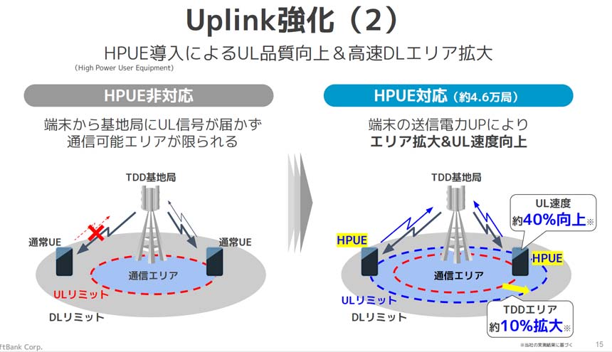 さらに、スマートフォンなどの端末の送信電力を高出力化する「HPUE(High Power User Equipment)」に対応した基地局を全国に約4万6000局展開。端末の送信電力がアップすることで、UL速度は約40倍、通信可能エリアは約10%拡大すると大矢氏は解説した。
