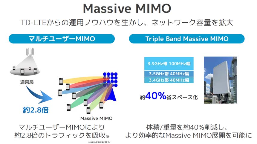 3つめが、Massive MIMOである。複数のユーザーに対して同時に異なるデータを送信できるマルチユーザーMIMO(MU-MIMO)を活用することで、従来比約2.8倍のトラフィックを吸収できるようになったという。また、3.4/3.5/3.9GHzに対応したトリプルバンドMassive MIMOの導入により、周波数ごとに無線機(RU)を個別に設置する必要がなくなり、約40%の省スペース化を実現したとのことだ。
