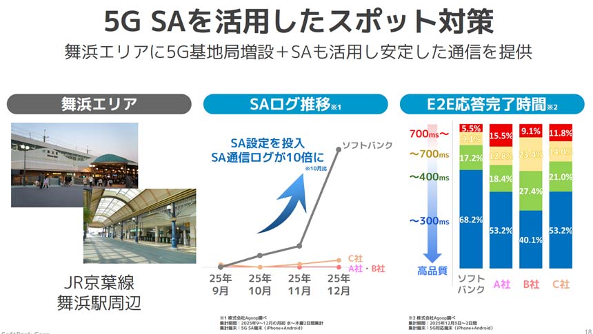 東京ディズニーランドの最寄り駅である舞浜駅では、5G基地局の増設と5G SAエリアの拡大に向けた取り組みを進めている。2025年12月時点の5G SA通信ログは前月比で約10倍に達しており、東京ディズニーランドの来園客で混雑する時間帯においても、通信を快適に利用できる環境が整いつつあるとした。