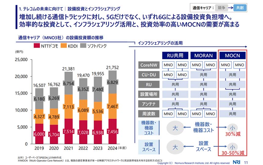 その共創領域の1つが、「ネットワーク(通信インフラ)」だ。NRIによれば、2024年度の通信事業者(NTTドコモ・KDDI・ソフトバンク)によるネットワーク設備への投資額は、2023年度比で約9%増加している。6G時代の到来により、設備投資額はさらに増大していくと予想される。
