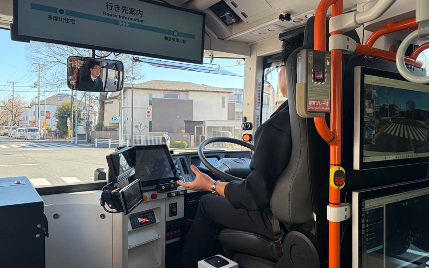 試乗会は、東京都狛江市の和泉多摩川駅周辺で実施し、走行ルートは約5.1km。車両にはティアフォー社が開発した自動運転EVバス「Minibus 2.0」を用い、自動運転レベル2(部分運転自動化)の実証を行った。