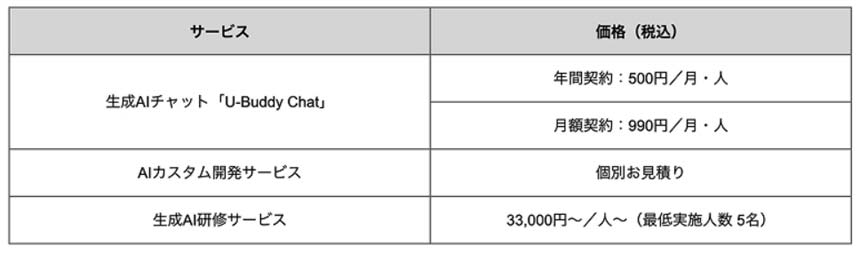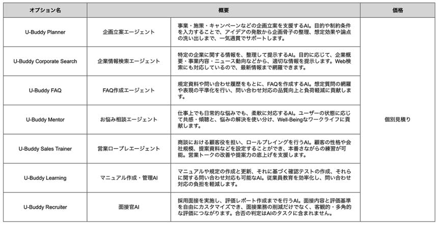 U-Buddy Chatは、ChatGPTやGemini、Claudeなどの主要LLM(大規模言語モデル)を単一のUI上で使い分けることができ、1ユーザーあたり、月額500円(税込)から導入可能だ。企画立案や企業情報検索、FAQ作成、営業ロールプレイングなど、業務や業種に応じた特化型ツール「U-Buddyエージェント」もオプションとして提供する。また、U-Buddy Chatを契約した企業を対象に、U-Buddyエージェントを約1カ月間無料で利用できるキャンペーンも実施する。
