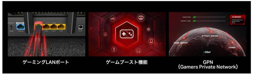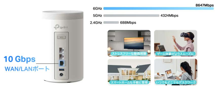 デュアルバンド(2.4/5GHz)に対応したArcher GE400は、ゲーミングに特化した機能を多数搭載。対象のアプリやデバイスの通信を優先処理することで、ジッターやラグを低減し、安定したプレイをサポートする。インターフェースは2.5Gbps WANポート×1、2.5Gbps LANポート×1、1Gbps LANポート×3、USB 3.0ポート×1を備え、6.5Gbpsの高速通信(ストリーム数:6)が可能だ。