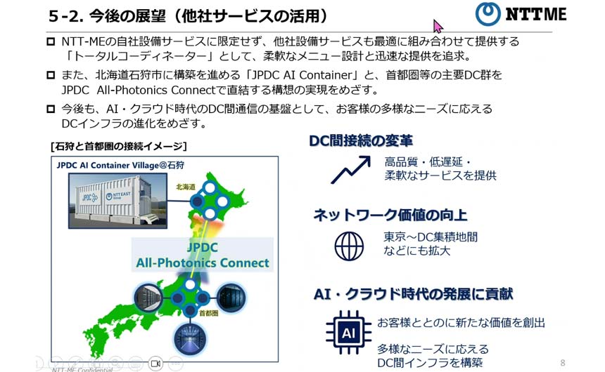 なおNTT-MEは、2025年度内に北海道石狩市で約5万㎡の用地を取得し、このエリアを「JPDC AI Container Village」と命名。最大で14基のコンテナ型DCを石狩市に建設する計画だが、このJPDC AI Container Villageと首都圏のDCをAPNで直結する構想も描いているという。