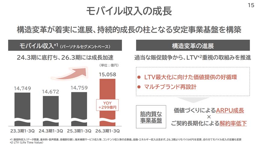 セグメント別に見ていくと、パーソナルセグメント/ビジネスセグメントともに好調だった。料金プラン「auバリューリンク マネ活2」の展開などが功を奏し、3Qまでのモバイル収入(パーソナルセグメント)は、前年度比299億円増の1兆5058億円となった。