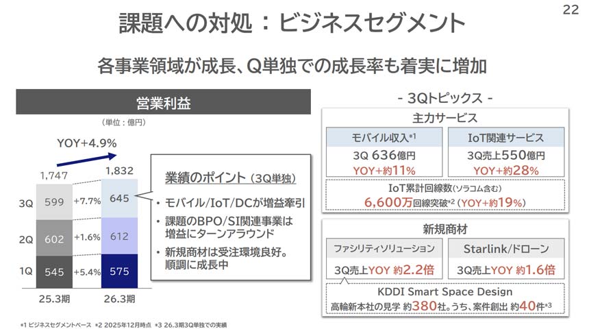 ビジネスセグメントの営業利益は前年度比4.9%増の1832億円だった。これまでの課題だったBPO事業とSI事業が増益に転じ、法人向けモバイル・IoTサービスなども引き続き堅調だった。