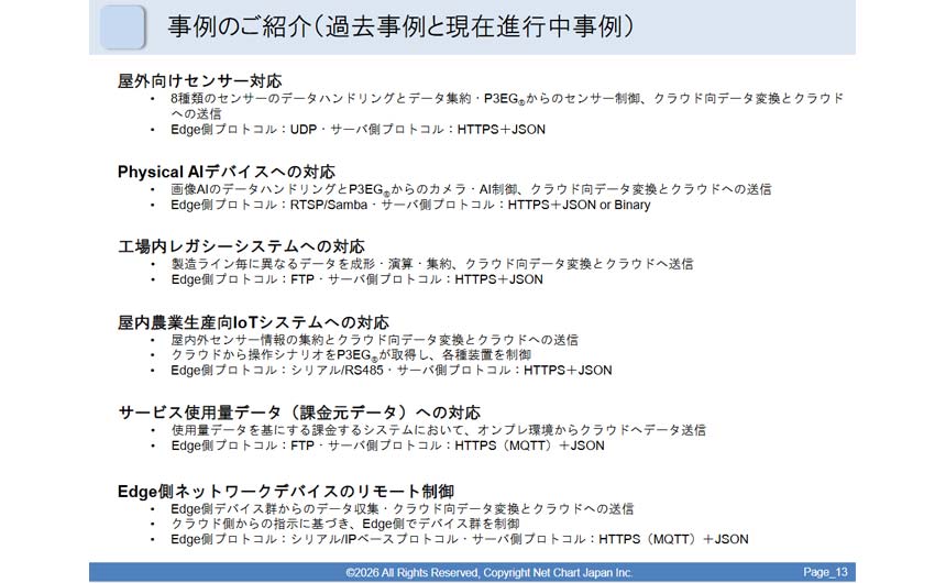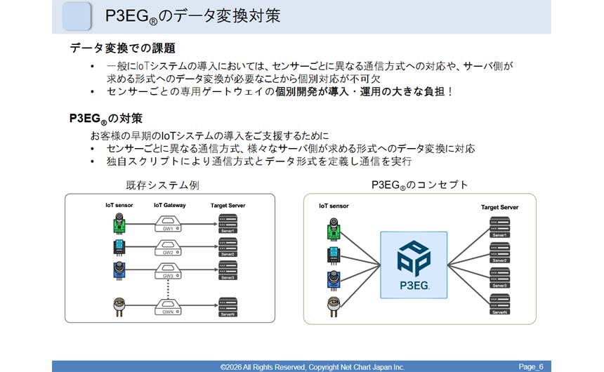 これに対しP3EGは、IPデバイスだけでなく、シリアル通信などの非IPデバイスなどから取得したデータを1台のIoTゲートウェイに集約可能。これらのデータは、JSONなどのサーバー側が要求する形式へ自動変換して送信できるという。