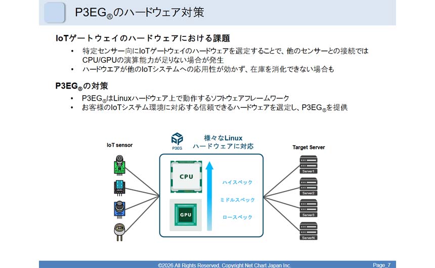 さらにP3EGは、Linuxベースの汎用ハードウェア上で動作するため、専用ハードウェアの新規開発が不要だ。加えて、ネットチャートがユーザーの利用環境や用途に応じて最適なハードウェアを選定したうえでP3EGを提供する。これにより、ユースケースに応じたCPU・GPU性能を備えたハードウェアを選択できるとした。
