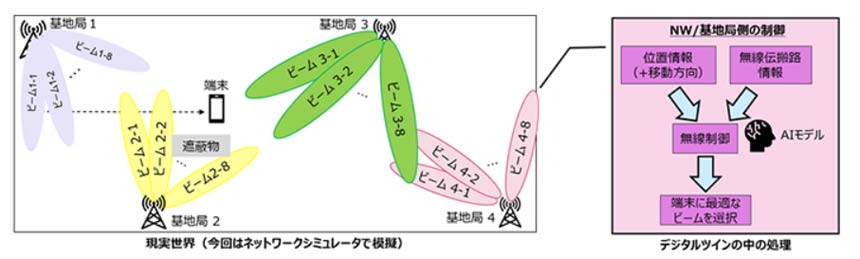 具体的には、東京駅周辺にある複数の基地局をデジタルツインで模擬したシミュレーション環境で実施した。各基地局はそれぞれ8ビームのビーム候補の中から、ネットワーク品質に応じて、端末にとって最適なビームを選択。これまでは、実際の環境で測定されるネットワーク品質を元にビーム選択を行っていたが、同実証では、デジタルツイン上のネットワーク品質測定結果とAIを組み合わせることによって、実際の環境でのネットワーク品質測定の回数を減らし、ビーム選択を行った。