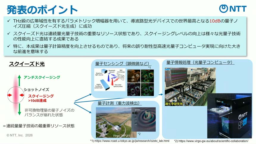 スクイーズド光とは、光の磁場を構成する正弦(sin)と余弦(cos)成分のうち、片方の量子ノイズを圧縮した光のことを指す。この圧縮度(スクイージングレベル)が高いほど、誤差の少ない量子計算が可能になる。また、広帯域なスクイーズド光は、計算の高速化と量子ビット数の増加に寄与するため、光量子コンピューターを支える中核技術の1つとしても期待されている。