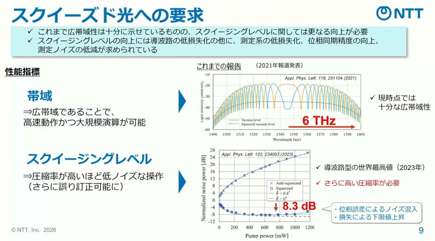 NTTと東京大学は2021年12月、6dBのスクイーズド光を6THz以上の帯域で生成・検出することに成功している。ただ、NTT先端集積デバイス研究所 准特別研究員の柏崎貴大氏によれば、「広帯域は十分に示せている」ものの、光量子コンピューターがより精度の高い計算を行うには「スクイージングレベルのさらなる向上が必要」になるという。